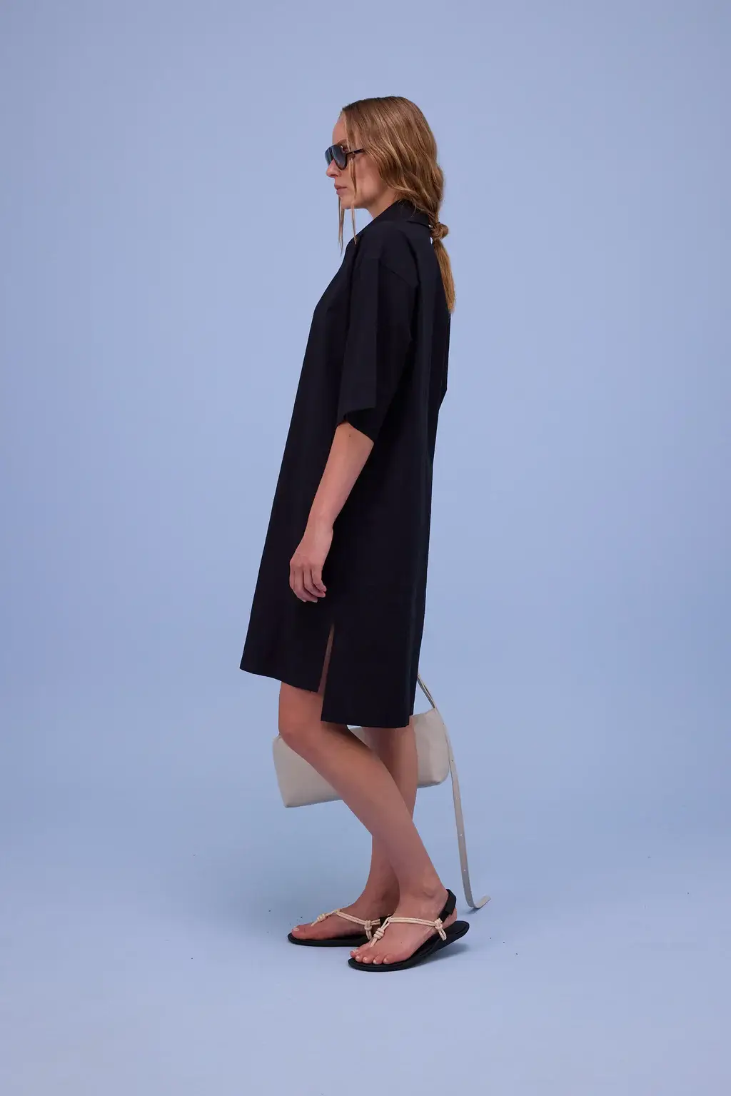 Rechtvallende polojurk in luchtige katoenen popeline met een natuurlijk kreukje in. De jurk valt tot op de knie, maar door de splits in de zijnaden, kan je deze ook vlot als tuniek dragen op een broek. De iets afhangende schouders en brede mouwen bepalen mee de casual-chic look van deze jurk.